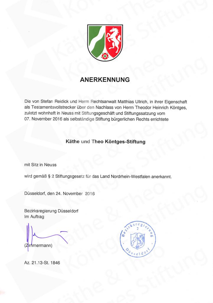 „Offizielle Anerkennungsurkunde der Käthe & Theo Köntges Stiftung – das rechtliche Fundament unserer gemeinnützigen Arbeit seit 2016.“